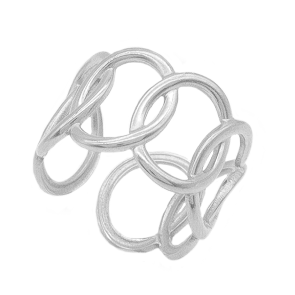 Este anel ajustável traz um design contemporâneo, composto por esferas interligadas e vazadas que criam um efeito de leveza e movimento no dedo. Confeccionado em aço inox com revestimento PVD prata, oferece alta resistência à oxidação e ao desgaste, mantendo seu brilho elegante por muito tempo. Seu acabamento polido valoriza cada curva das esferas, tornando-o perfeito para complementar tanto look do dia a dia quanto produções mais sofisticadas.