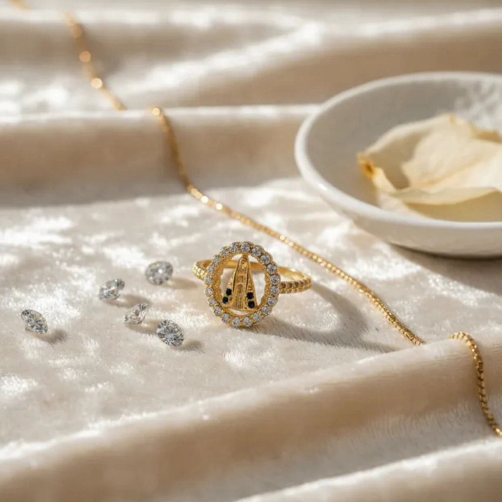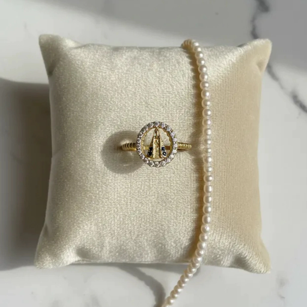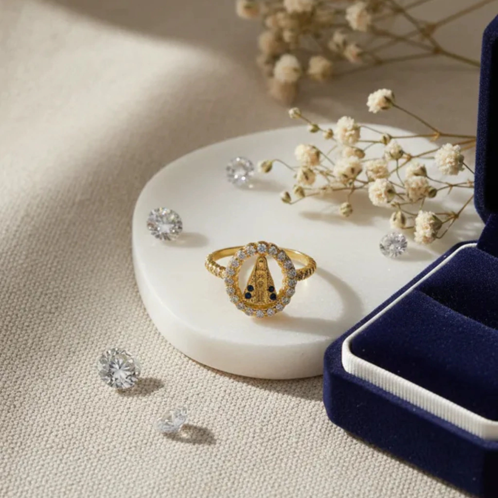 Inclua o Anel Cravejado Nossa Senhora com Zircônia banhado a ouro e adicione um toque de brilho sofisticado às suas composições.