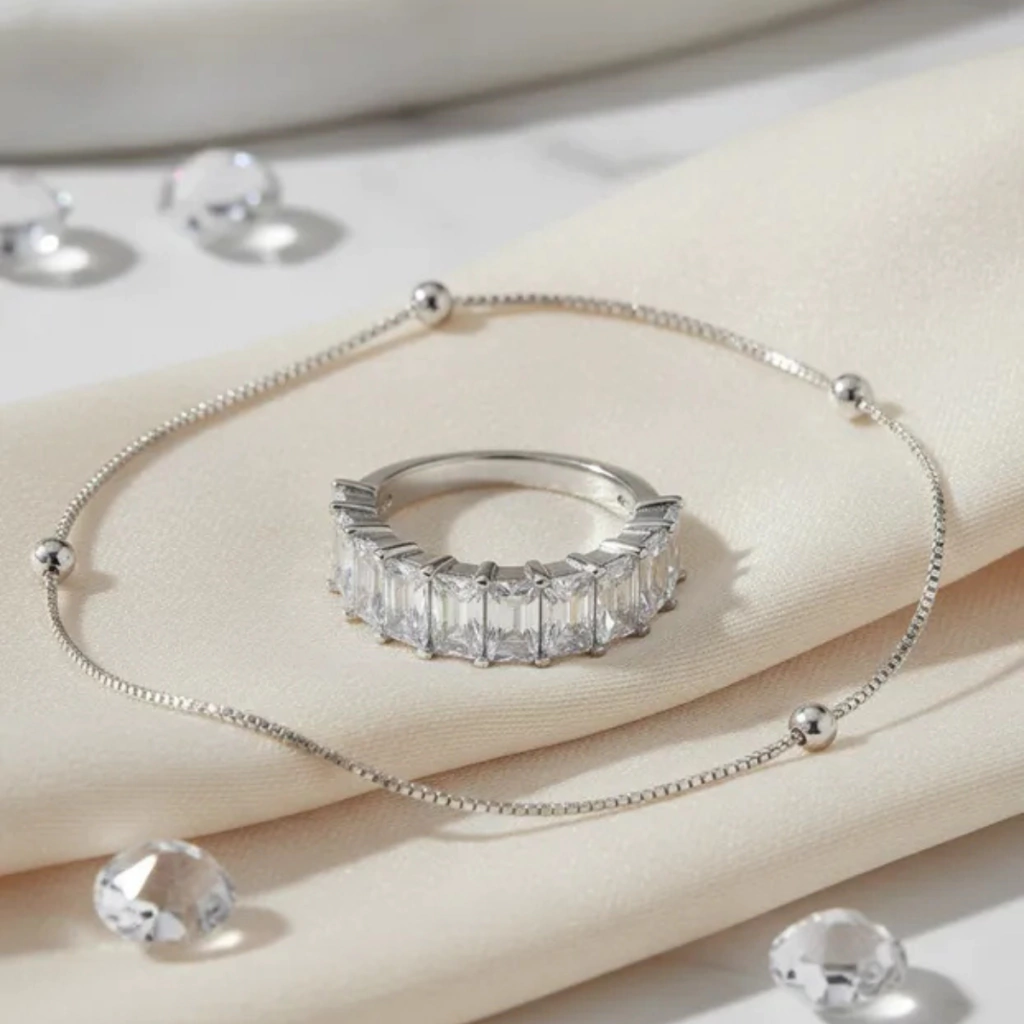 Brilho sofisticado da zircônia cristal com resistência do aço inox e acabamento PVD prata.