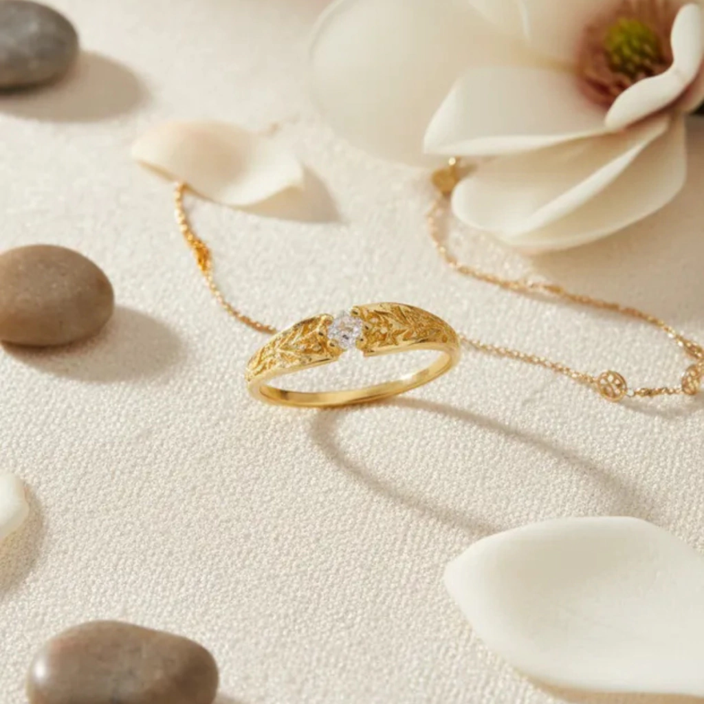 Delicadeza com detalhe artístico: solitário infantil em dourado com meia lateral desenhada.