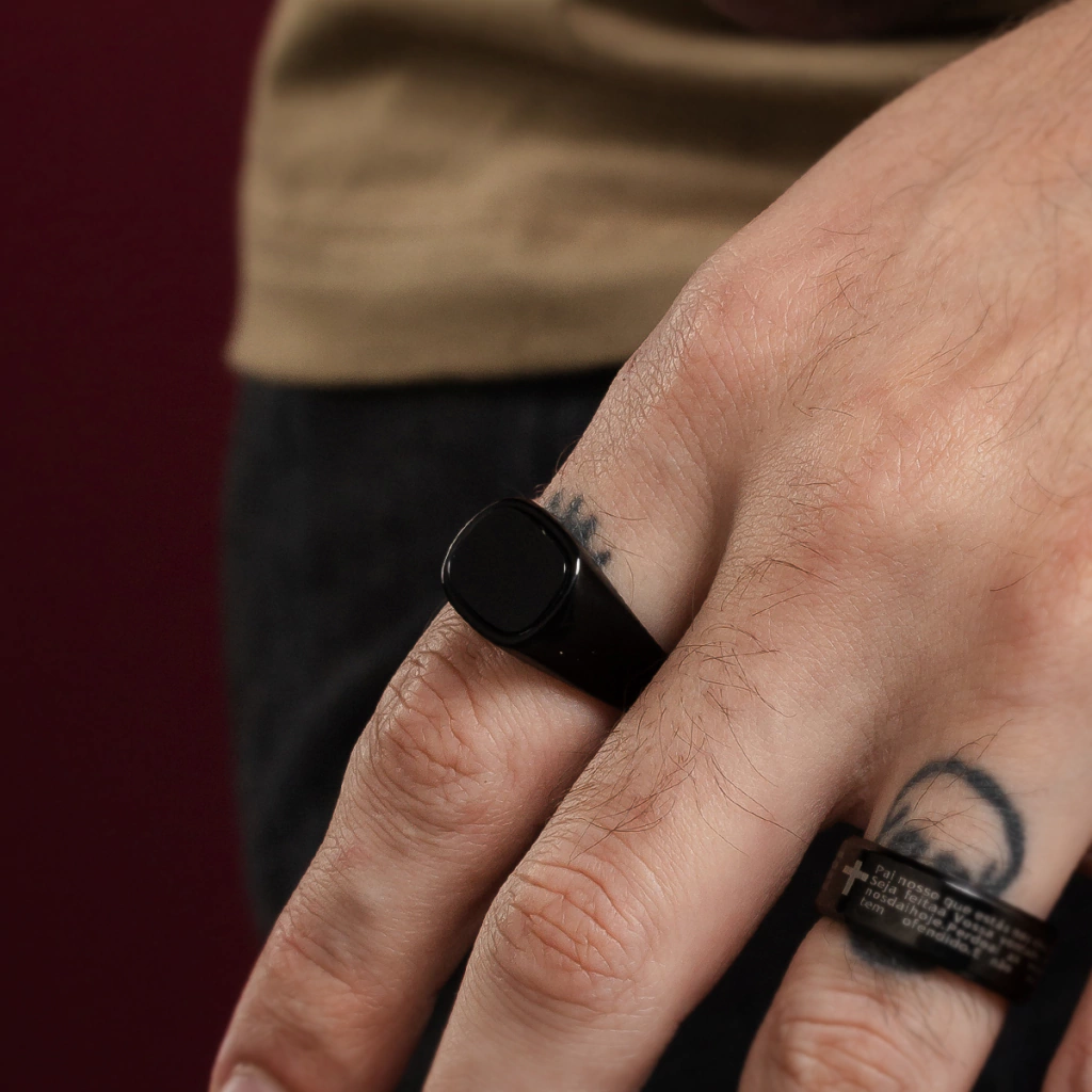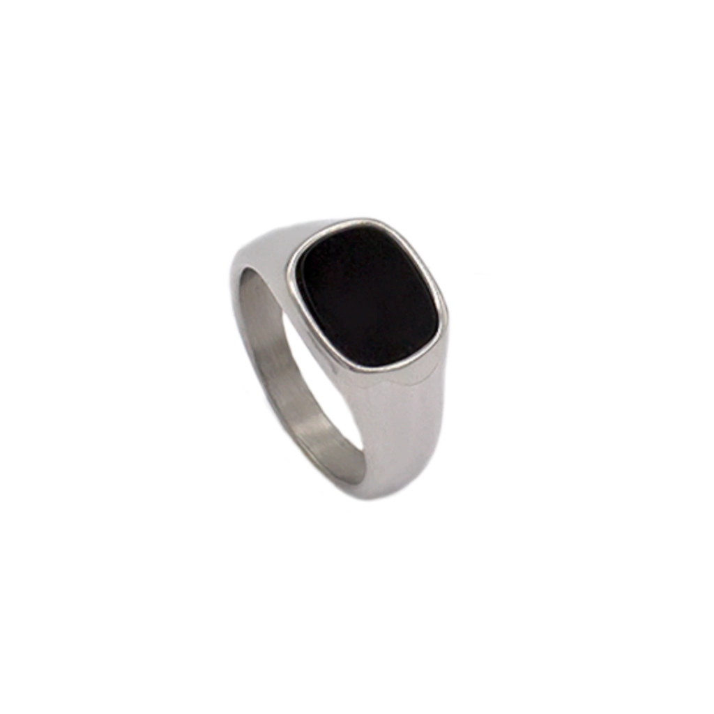 Minimalismo imponente: elegância metálica e pedra ônix em um anel sofisticado e resistente.