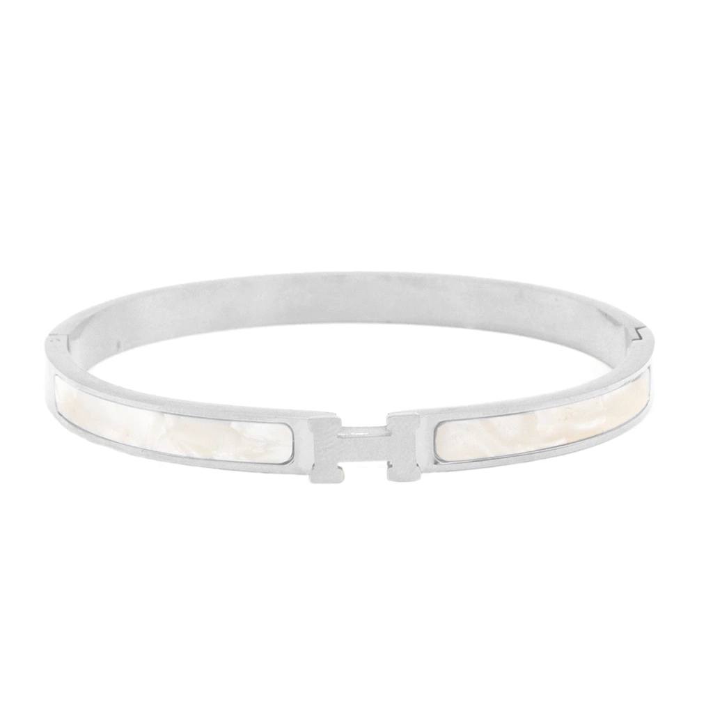 Este bracelete rígido combina a luminosidade da madrepérola natural com um minimalista detalhe “H” liso, tudo em aço inox de alta resistência com revestimento PVD prateado. A peça equilibra delicadeza e contemporaneidade, ideal para valorizar o pulso em produções do dia a dia ou eventos especiais. O revestimento PVD garante proteção contra riscos e corrosão, mantendo o brilho prateado impecável.