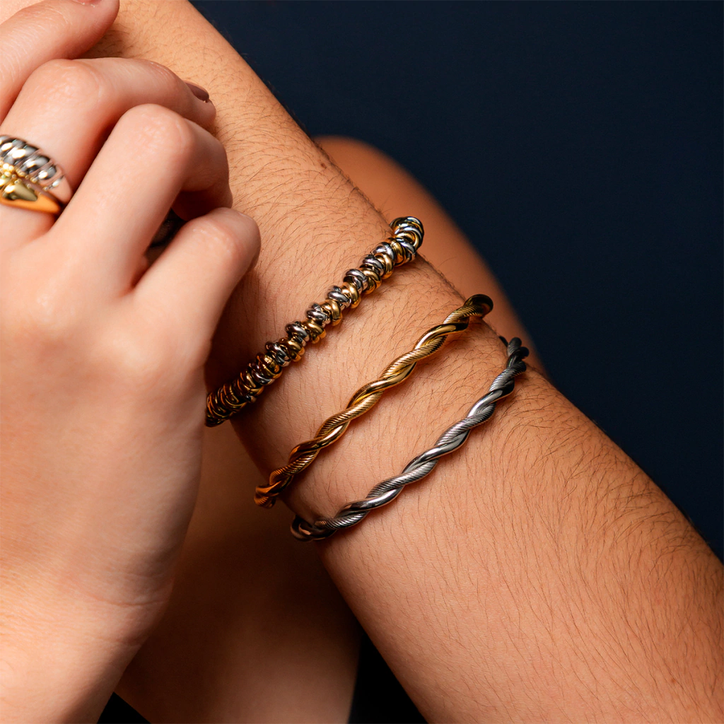 Este bracelete feminino apresenta elos rígidos interligados em um padrão trançado que confere personalidade e movimento ao pulso. Confeccionado em Aço Inox, oferece durabilidade e resistência à oxidação, mantendo seu brilho natural mesmo com uso contínuo. O design rígido aliado à trama trançada cria um contraste entre robustez e fluidez, tornando-o versátil para complementar tanto look do dia a dia quanto composições mais elaboradas.