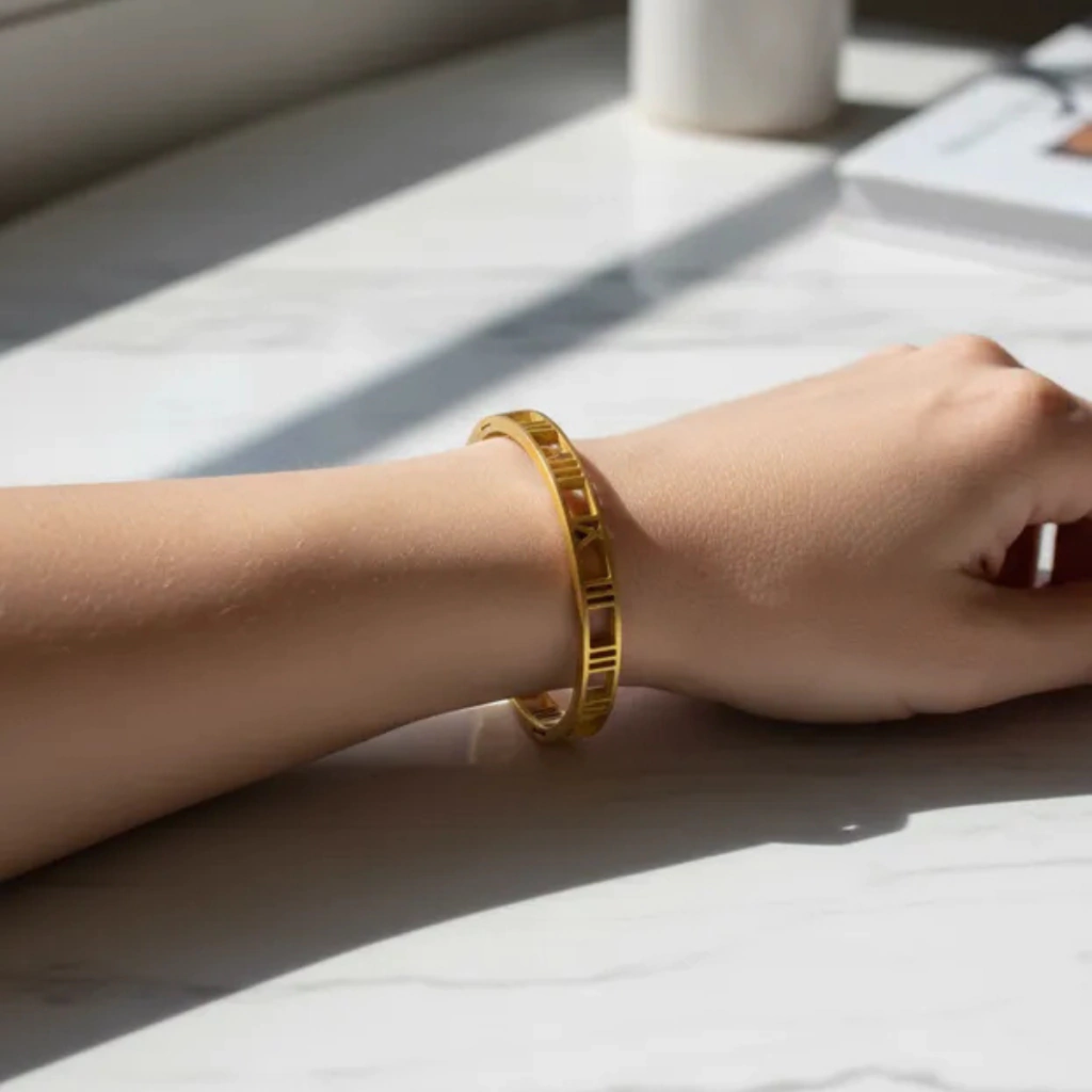 Adicione um toque de história e modernidade ao seu pulso com este bracelete de números romanos vazados em PVD dourado o acessório perfeito para marcar seu estilo!