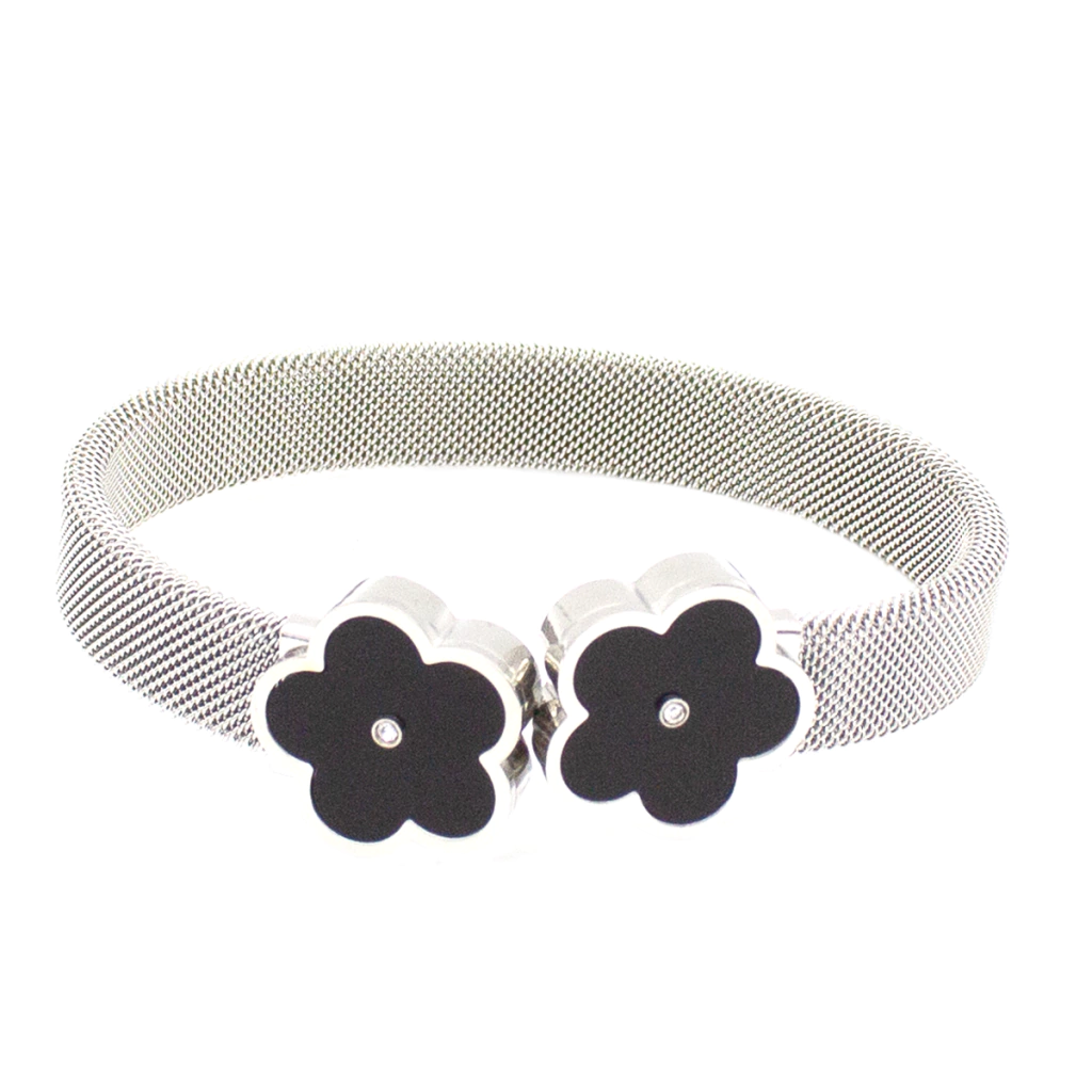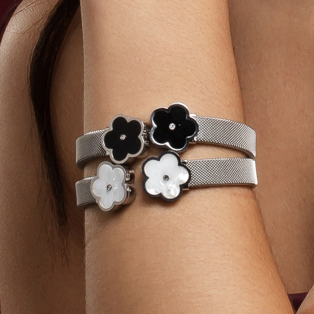 Este bracelete rígido em aço inox com revestimento PVD prateado exibe uma flor em madrepérola preta, com zircônia no centro que confere contraste e personalidade. O design leve permite usar a peça tanto de dia quanto à noite. Durável e resistente, mantém seu brilho e cor mesmo com uso frequente.