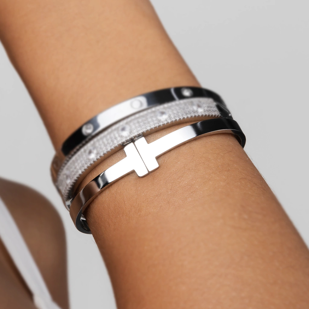 Adicione elegância funcional ao seu estilo garanta agora o bracelete rígido com abertura central e destaque-se com um acessório moderno, prático e atemporal.
