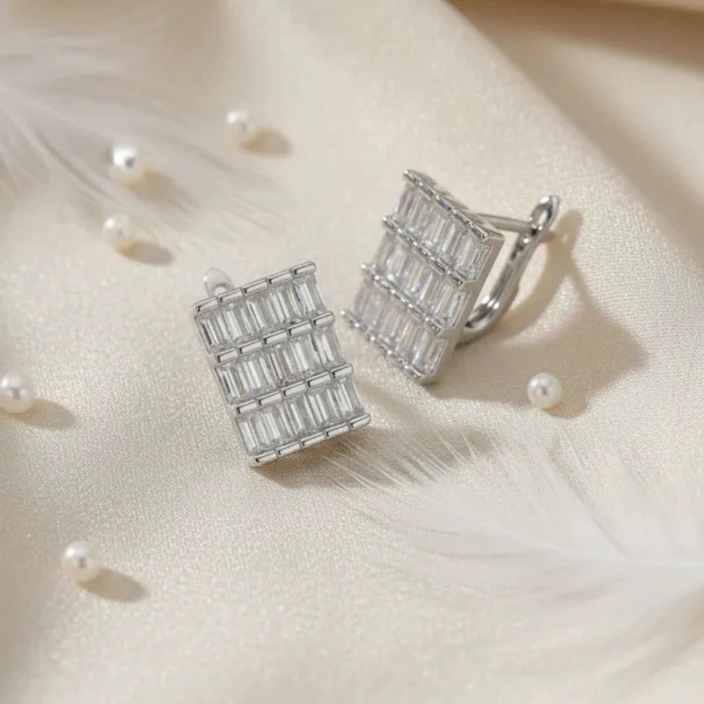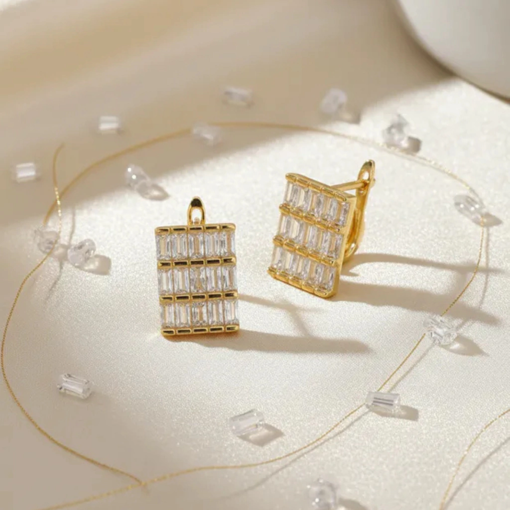 Geometria moderna com brilho dourado: argola quadrada realçada por zircônias.