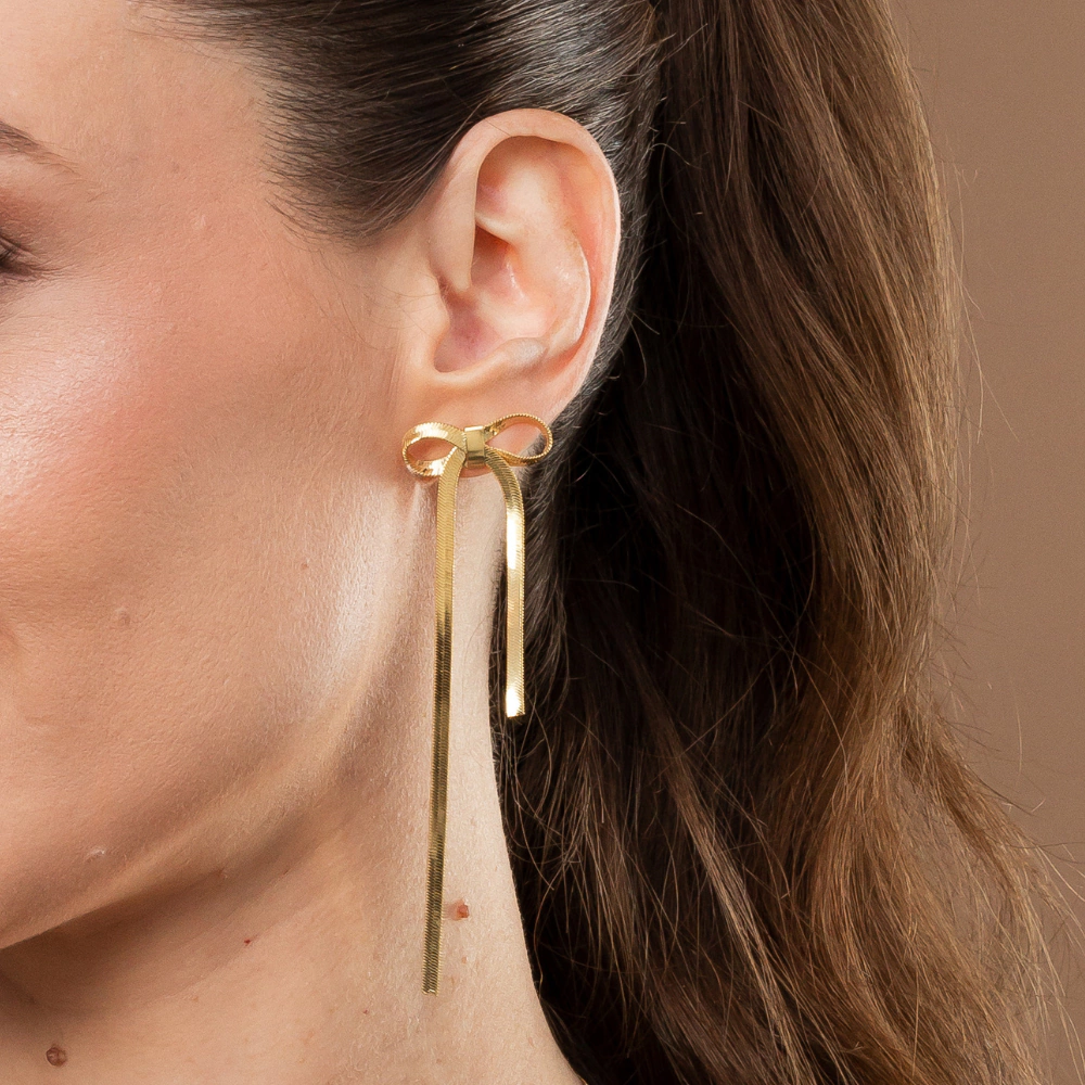Atualize seu estilo com um toque de charme e movimento garanta agora o brinco laço banhado a ouro e destaque sua delicadeza com elegância moderna.