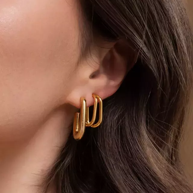 Argola sofisticada com dupla oval geométrica, durabilidade do aço inox e brilho intenso do PVD dourado.