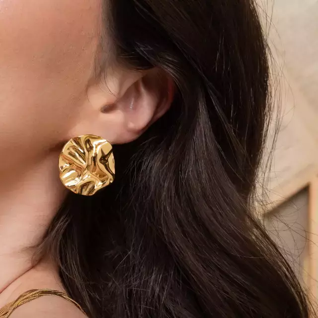 Inclua este brinco redondo texturizado em sua coleção e descubra a elegância natural do acabamento PVD dourado!