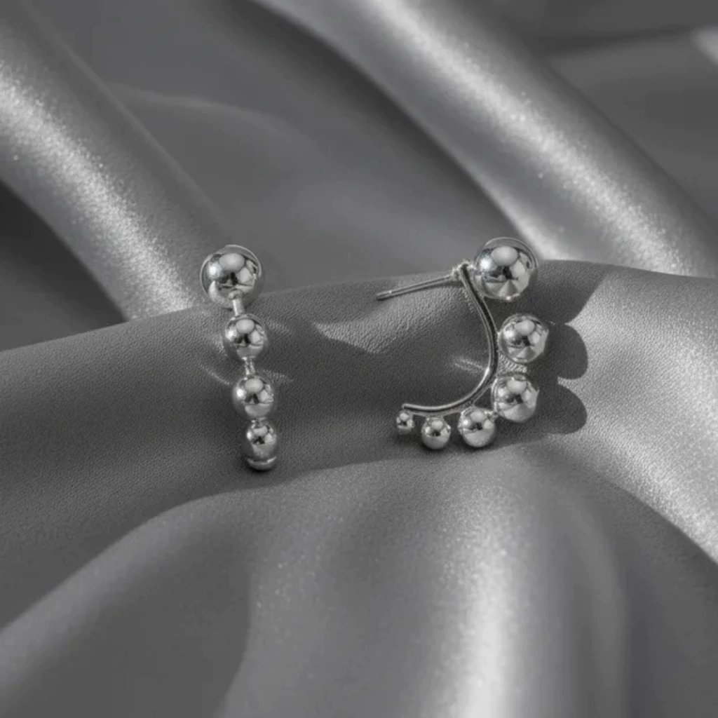 Leve elegância e leveza para o seu look garanta agora o brinco meia argola de bolinhas banhado a ródio e adicione um toque moderno e refinado ao seu dia a dia.