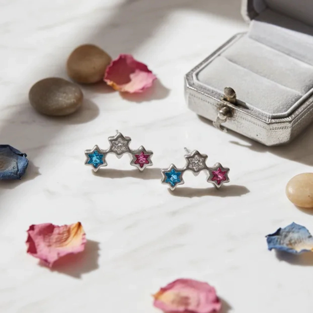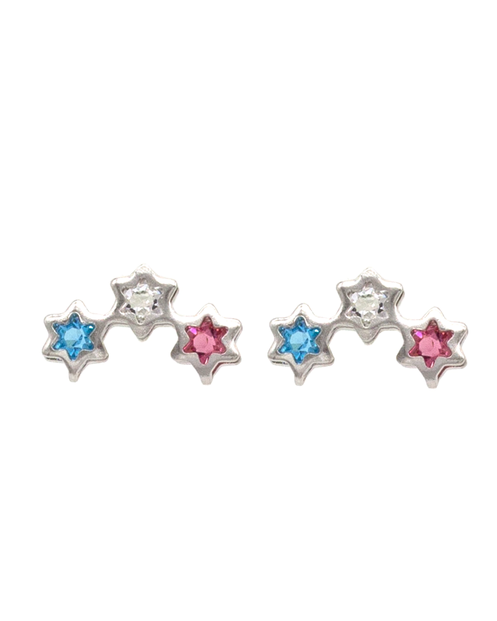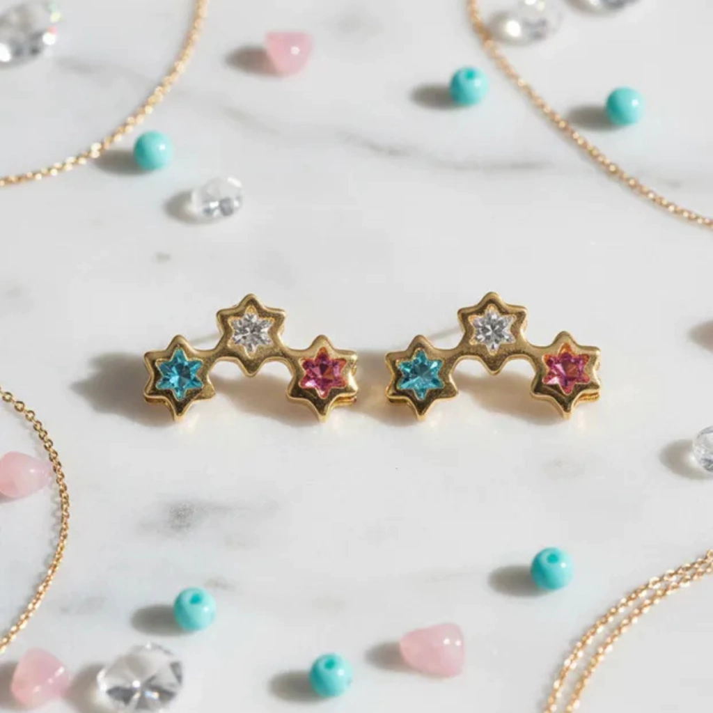Brilho dourado com toque lúdico: estrelas coloridas que destacam a orelha com delicadeza.