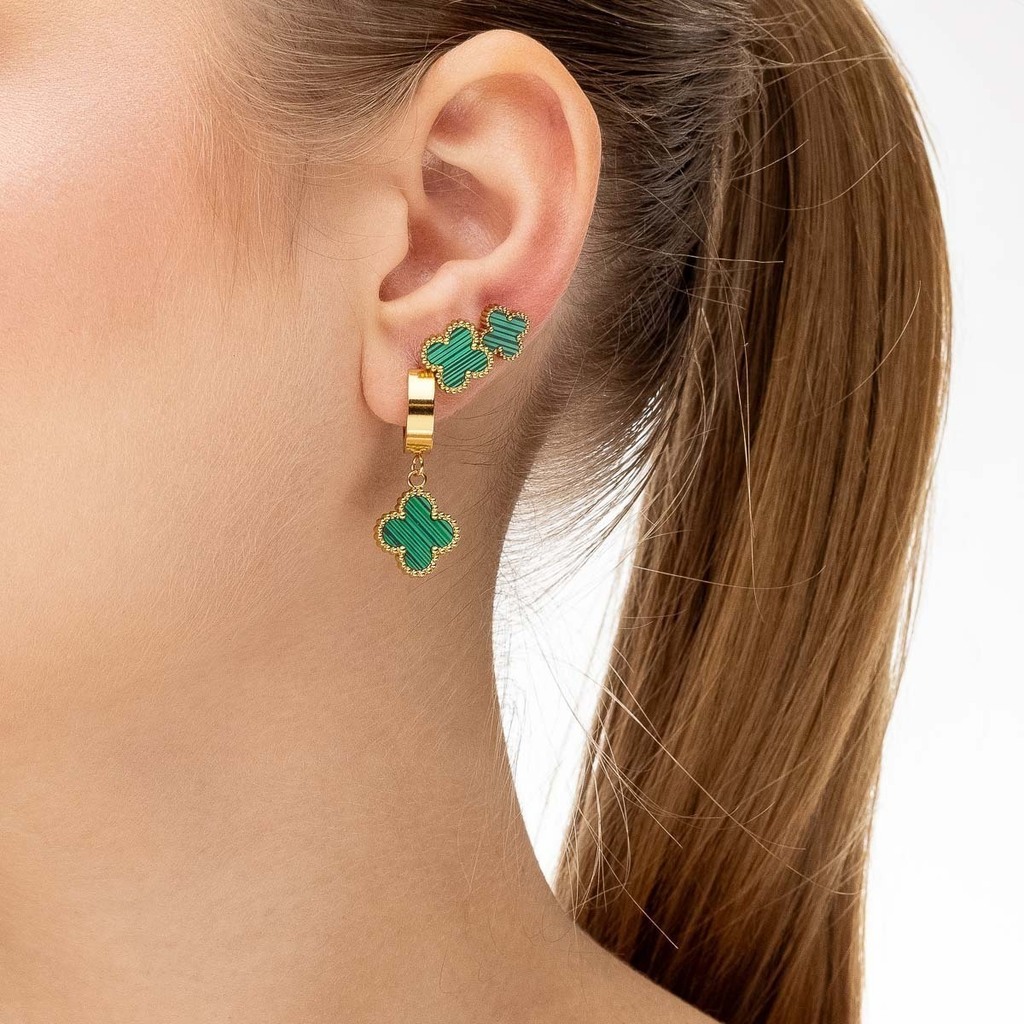 Conjunto elegante em aço inox dourado, composto por trio de brincos em formato de trevo, símbolo clássico de sorte e sofisticação.