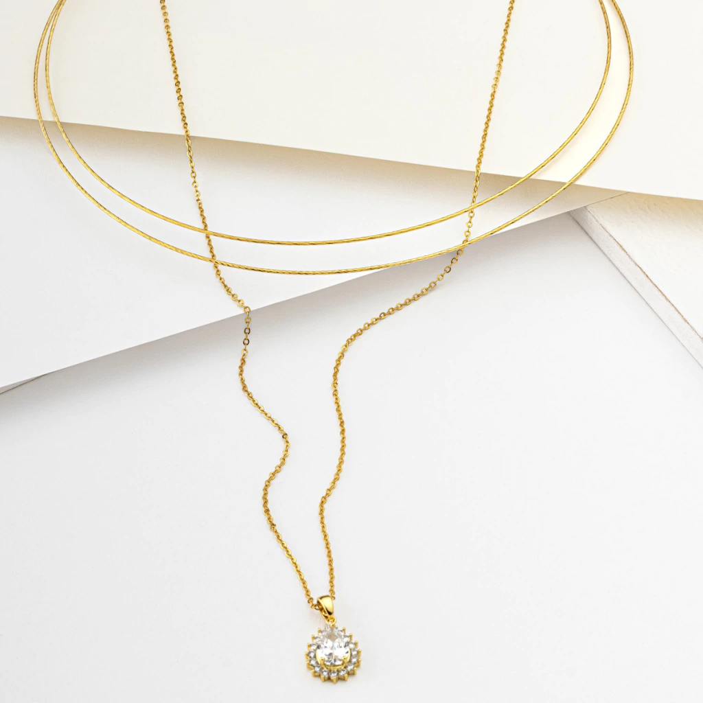 Duas camadas: corrente delicada + pingente em gota cravejada para um dourado que ilumina.