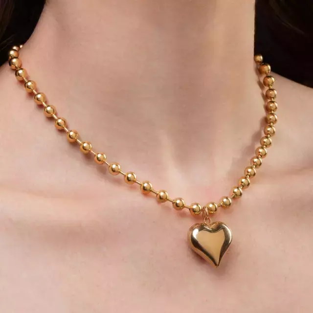 Peça delicada com pingente de coração liso e corrente de bolinhas, durabilidade do aço inox e brilho dourado.