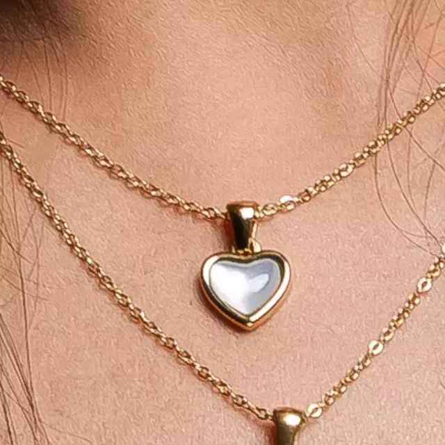 Peça elegante com corrente em elo português e coração de madrepérola, acabamento dourado resistente.