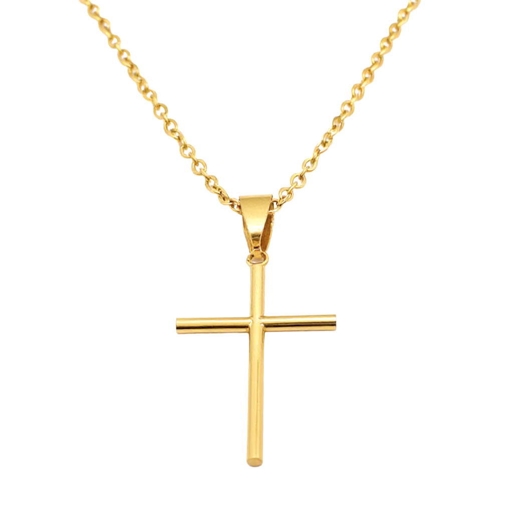 Pingente de cruz minimalista com brilho PVD dourado leve, elegante e durável