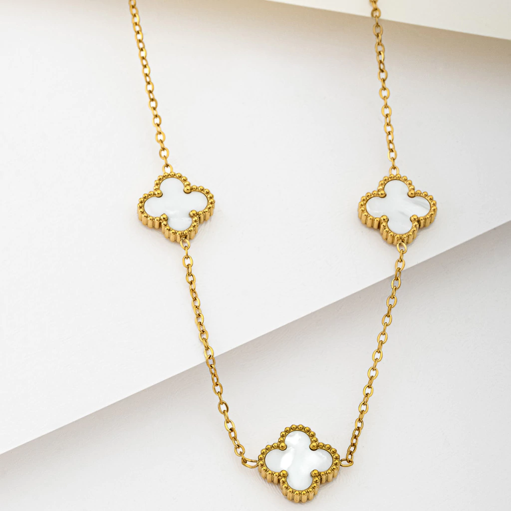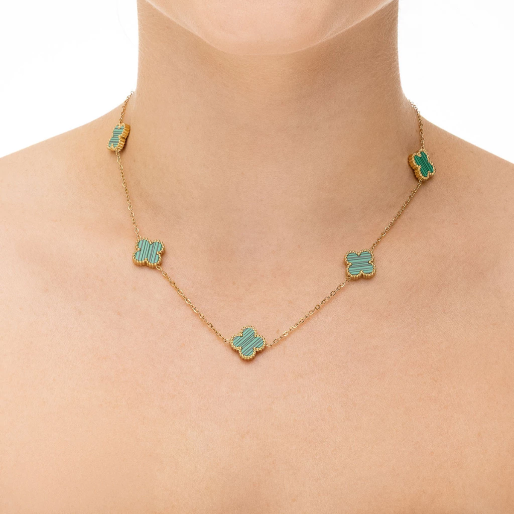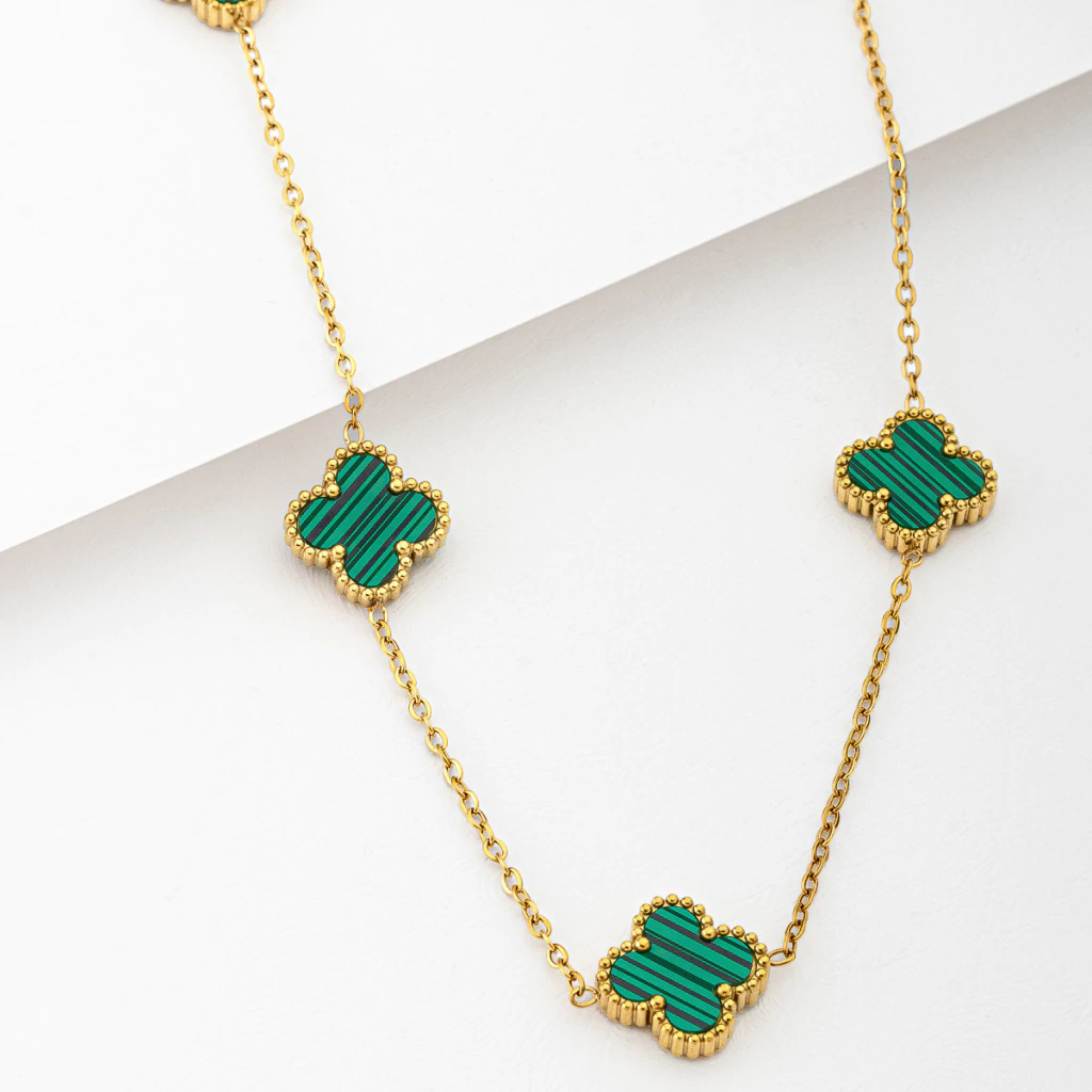 Corrente delicada em aço inox dourado com pingentes em formato de trevo esmaltados, símbolo clássico de sorte e sofisticação.