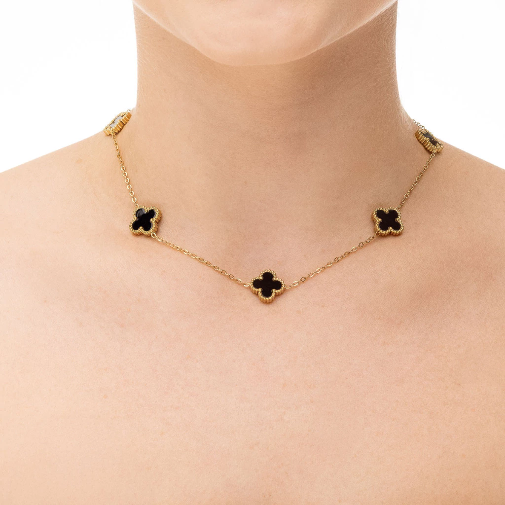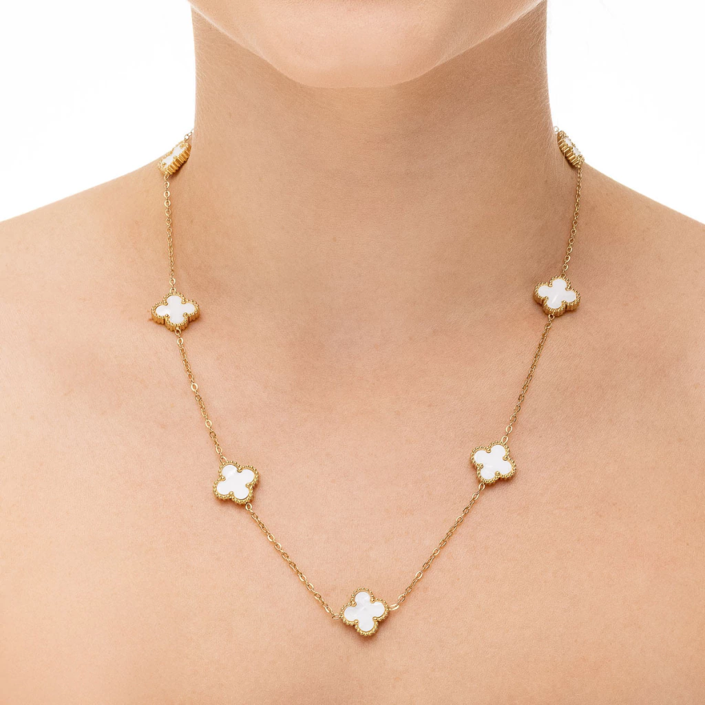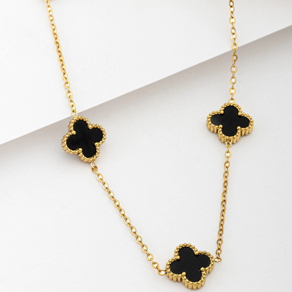 Corrente delicada em aço inox dourado com pingentes em formato de trevo esmaltados, símbolo clássico de sorte e sofisticação.