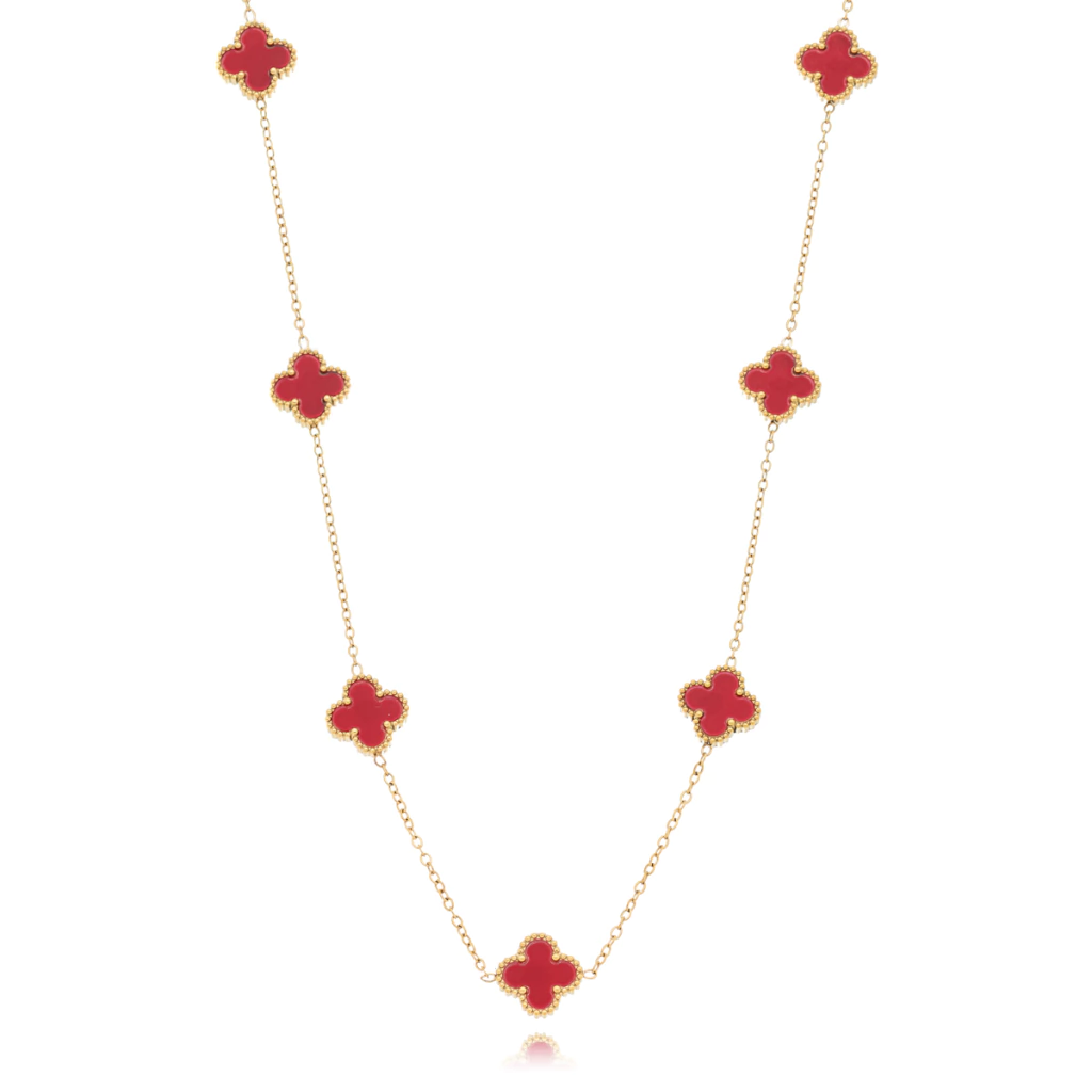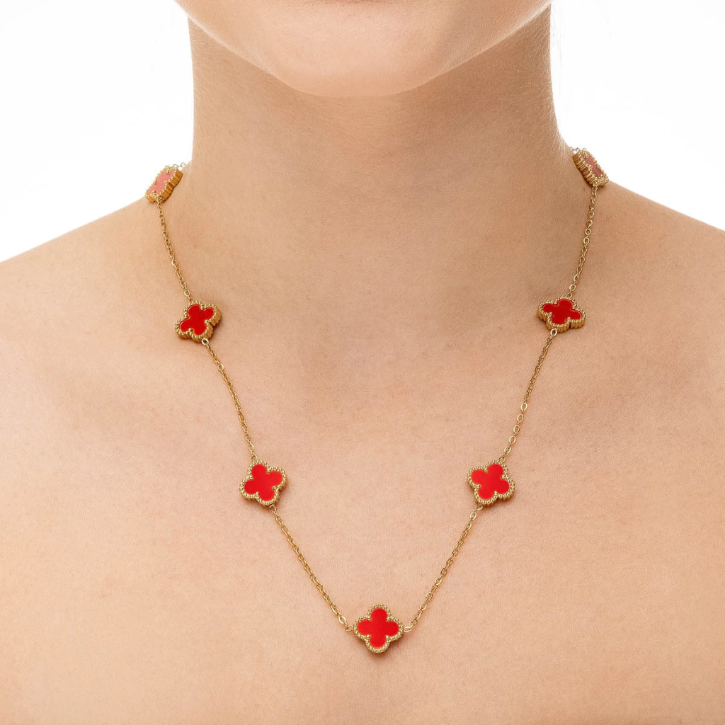 Este colar feminino apresenta uma sequência harmoniosa de trevos esmaltados, cada um contornado por bordas trabalhadas em bolinhas douradas que realçam o contraste entrea cor vibrante e o dourado intenso. O design leve e versátil valoriza o colo com elegância, podendo ser usado tanto sozinho como peça de destaque quanto combinado com outros colares para compor um mix moderno e cheio de personalidade.