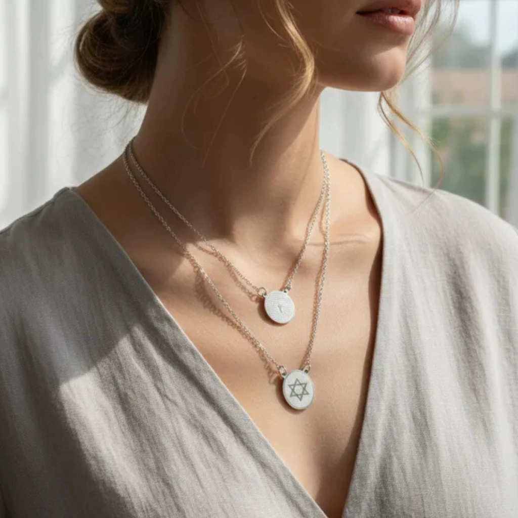 Una duas devoções em um só acessório. Este escapulário apresenta pingentes ovais Estrela de Davi e Oração do Pai Nosso, fabricados em aço inoxidável antialérgico e finalizados com PVD prata. O processo sela a cor ao metal em nível molecular, garantindo brilho espelhado que não oxida, não descasca e resiste ao uso diário. Os pingentes posicionam se de forma equilibrada ao longo da corrente, oferecendo conforto e um toque de sofisticação discreta, perfeito para expressar sua fé com estilo contemporâneo.