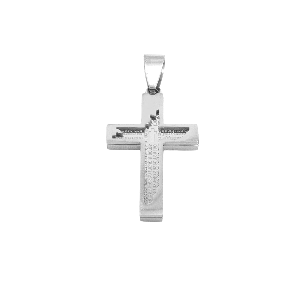 Este pingente une duas cruzes sobrepostas com a Oração do Pai Nosso gravada, confeccionado em aço inoxidável antialérgico e finalizado com PVD prata. O processo sela a cor ao metal em nível molecular, garantindo brilho espelhado que não oxida, não descasca e resiste aos riscos do uso diário. O design de cruz dupla cria profundidade e presença sem pesar, enquanto a gravação da oração confere significado espiritual. Ideal para correntes finas ou médias, é a escolha perfeita para expressar fé com sofisticação atemporal.