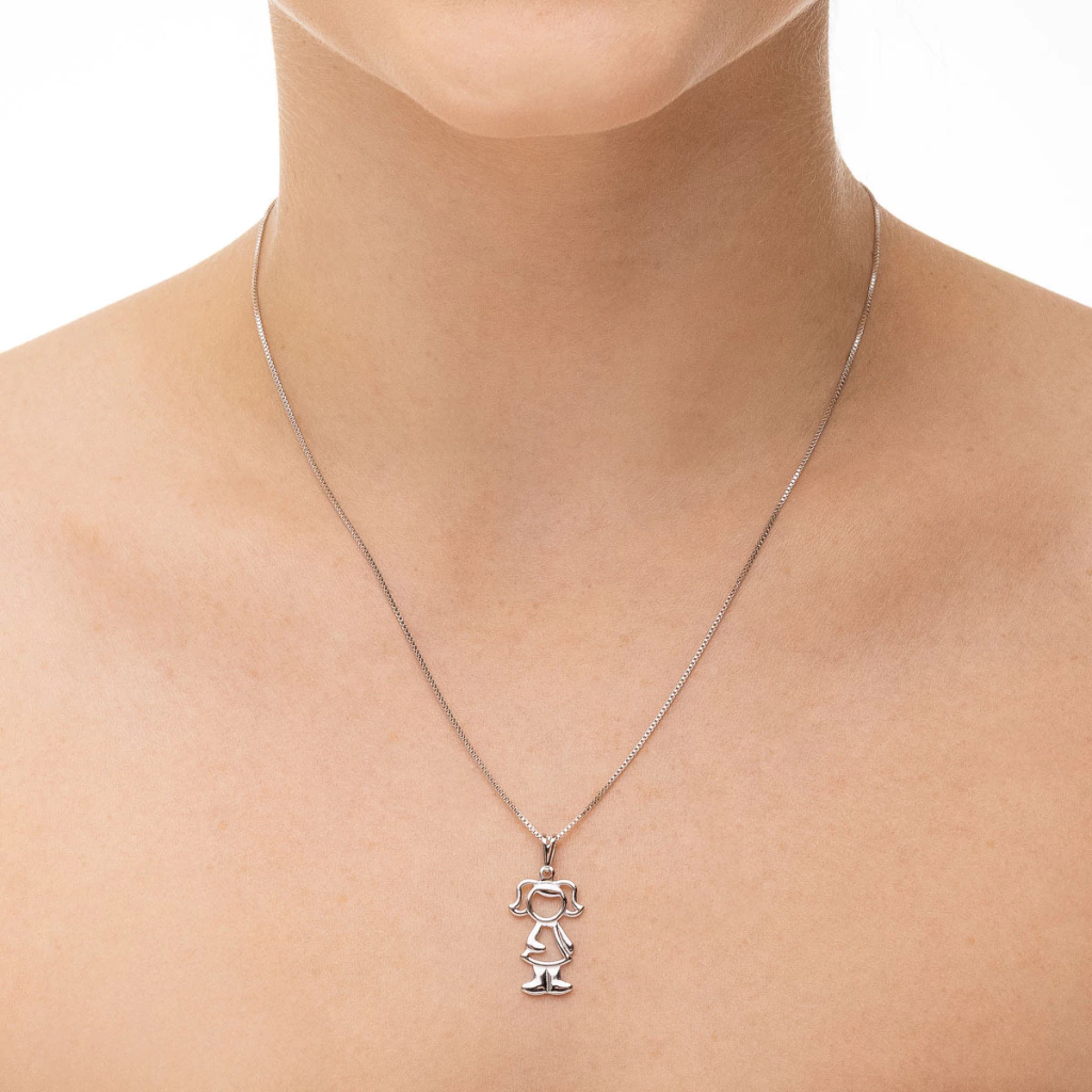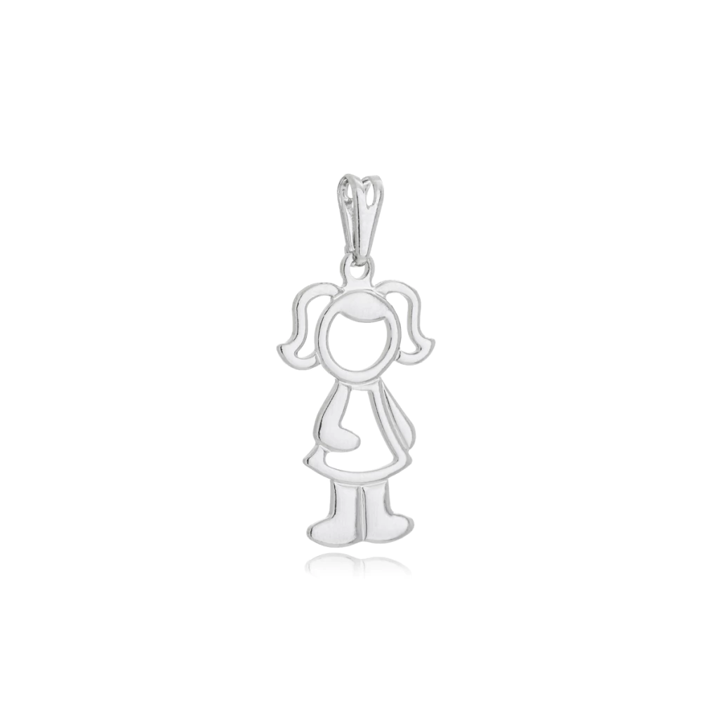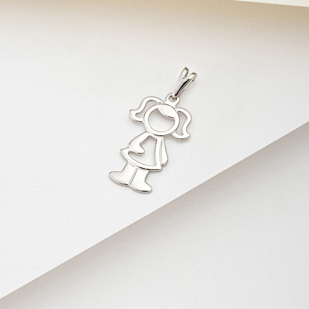O Pingente de Menina Vazado apresenta a silhueta minimalista da menina em um design vazado e leve. O banho de ródio confere acabamento prateado moderno e fácil de combinar. Use solo para um destaque sutil ou crie um mix de pingentes com iniciais e símbolos.