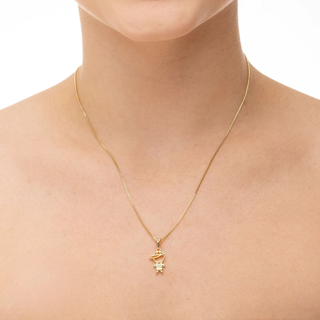 O Pingente de Menino Delicado Cravejado apresenta a silhueta infantil contornada por microzircônias, entregando brilho sutil e elegante. O banho de ouro aquece o visual e realça os detalhes perfeito para correntes finas, chokers e mix de pingentes (inicial, coração, menina). Ótima opção para uso diário e para presentear.