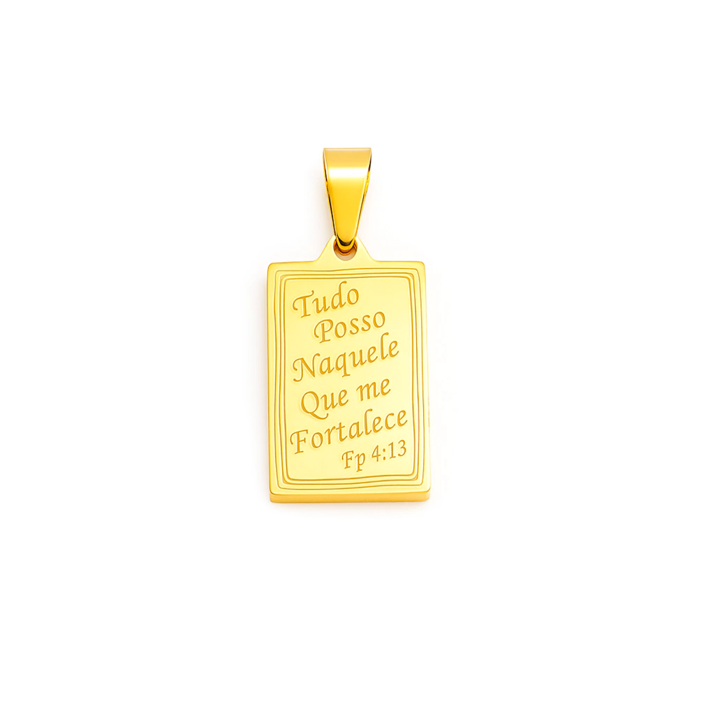 Com dimensões de 1,5 × 1,0 cm, este pingente traz a frase “Tudo Posso Naquele que me Fortalece” (Filipenses 4:13) cuidadosamente gravada em aço inoxidável antialérgico, finalizado com PVD dourado. O processo sela a tonalidade ao metal em nível molecular, garantindo brilho intenso que não oxida, não escurece e resiste aos riscos do uso diário. Ideal para correntes finas ou médias, combina significado espiritual com acabamento premium, permitindo que você carregue sua inspiração sempre junto ao coração com discrição e estilo.