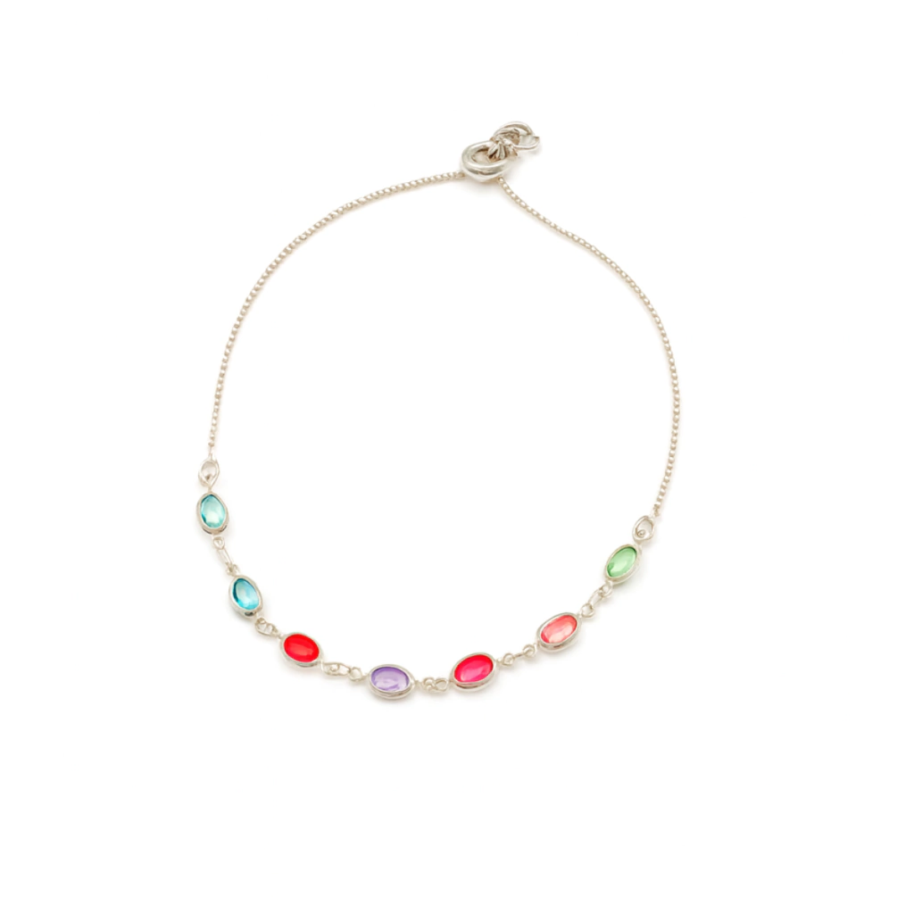 Brilho prateado com toque de cor: uma pulseira moderna e delicada para expressar sua beleza com sutileza.