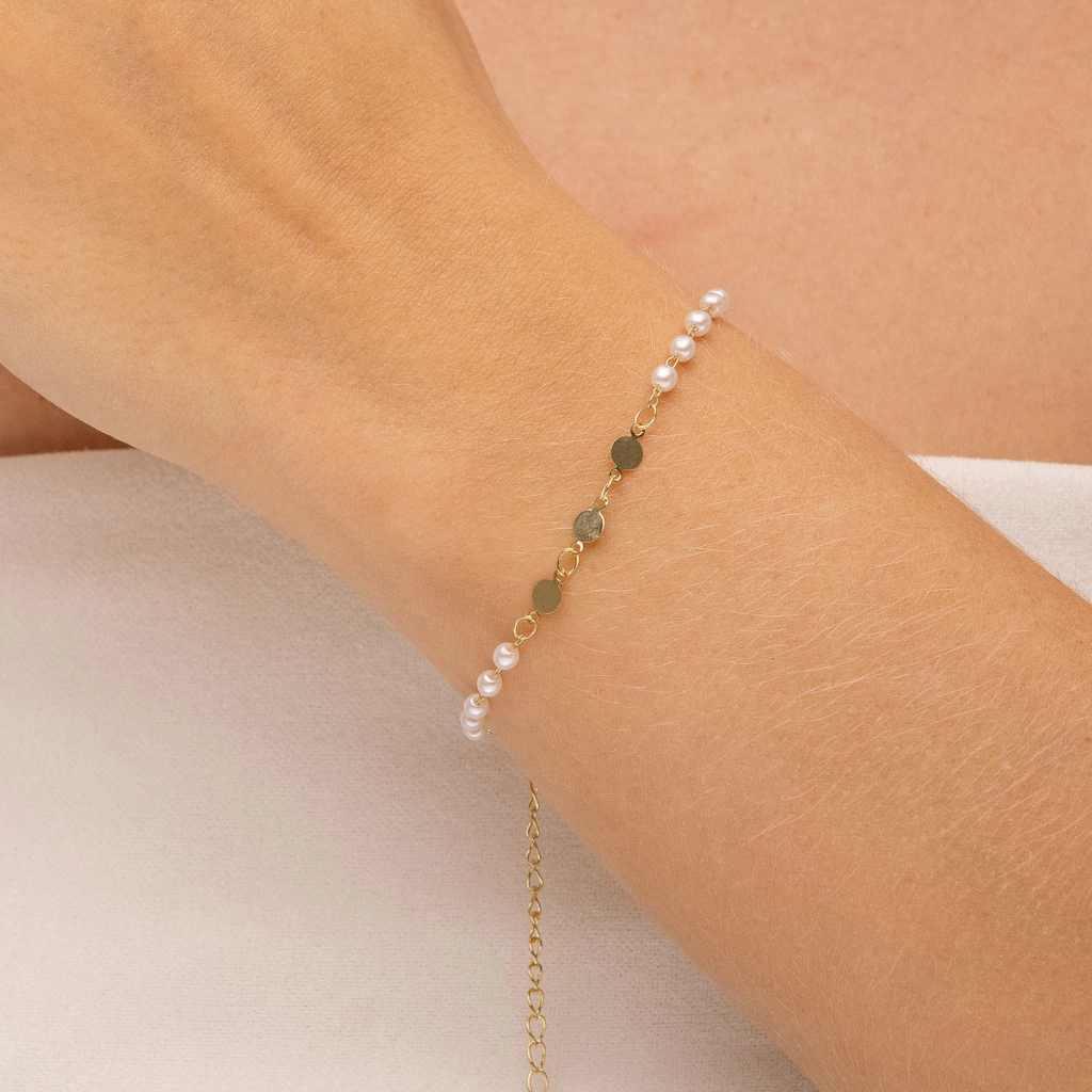 A Pulseira de Pérolas com Chapinhas combina a sofisticação das pérolas ao toque contemporâneo das chapinhas em acabamento prateado. O banho de ródio garante brilho elegante e curinga, perfeito para compor do casual às produções clássicas sozinha ou no mix com outras pulseiras.