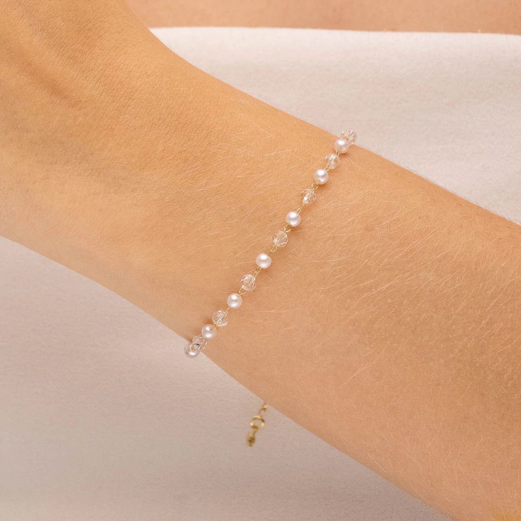 A Pulseira de Pérolas Delicadas une o charme clássico das pérolas ao acabamento prateado do banho de ródio, entregando sofisticação fácil de combinar com qualquer look. Leve e confortável, vai bem sozinha ou em stack com correntes e braceletes.