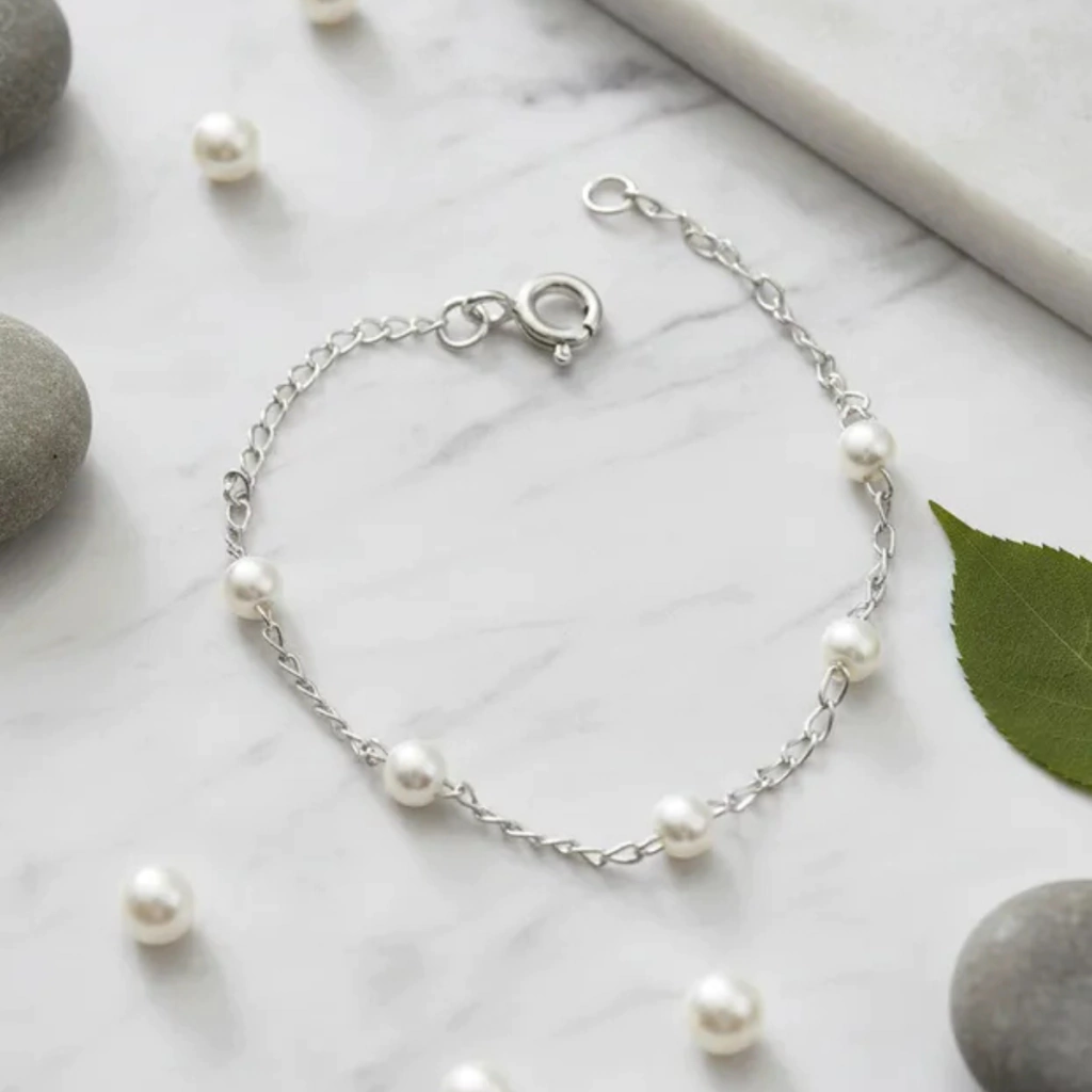 Brilho prateado e pérolas suaves: uma pulseira leve e encantadora para as pequenas que amam estilo com ternura.