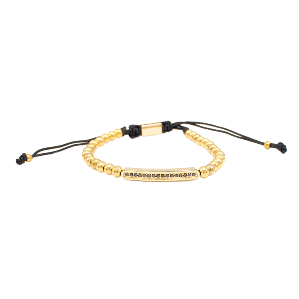 Esta pulseira masculina apresenta esferas polidas intercaladas por um detalhe central retangular, cravejado em zircônias que refletem a luz a cada movimento. Confeccionada em aço inox com revestimento PVD dourado, a peça oferece resistência à oxidação e ao desgaste, mantendo seu brilho mesmo com uso contínuo. Graças ao sistema ajustável por cordão trançado, adapta-se confortavelmente a diferentes tamanhos de pulso, proporcionando segurança sem apertar. Versátil, pode ser usada sozinha para realçar o pulso ou combinada com outras pulseiras para composições modernas, ideal tanto para o dia a dia quanto para ocasiões especiais.