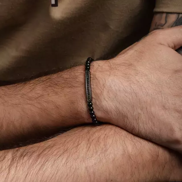 Esta pulseira masculina combina esferas polidas em aço inox PVD preto com um detalhe central retangular, totalmente cravejado em zircônias pretas que refletem a luz sutilmente. O banho preto confere um visual moderno e resistente à oxidação, preservando o acabamento mesmo com uso diário. Graças ao cordão trançado ajustável, a peça adapta-se facilmente a diferentes tamanhos de pulso, garantindo encaixe seguro e confortável sem apertar. Versátil, pode ser usada sozinha para valorizar o pulso ou em conjunto com outras pulseiras para criar composições mais ousadas, ideal tanto para looks casuais quanto para ocasiões especiais.
