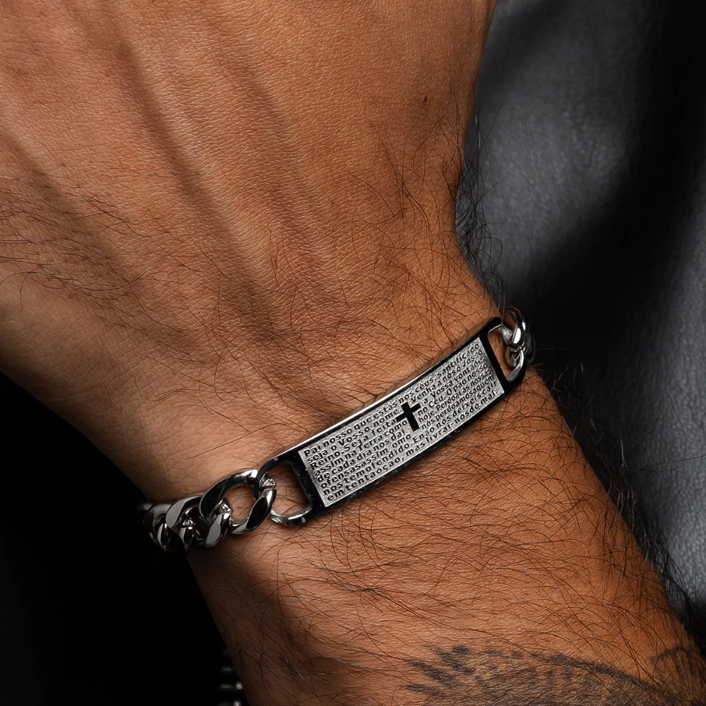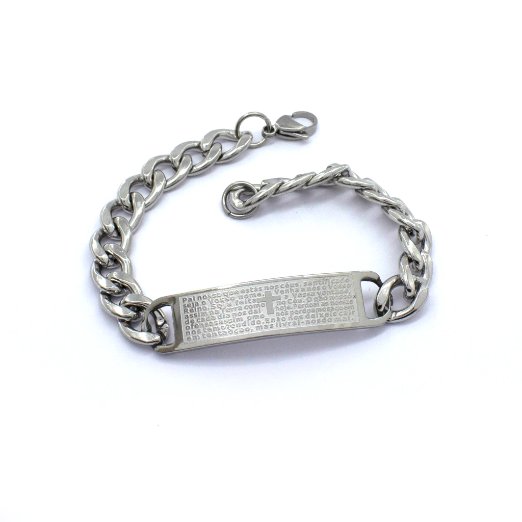 Leve proteção e fé com você todos os dias garanta agora a pulseira Pai Nosso em aço inox e expresse sua espiritualidade com estilo e resistência.